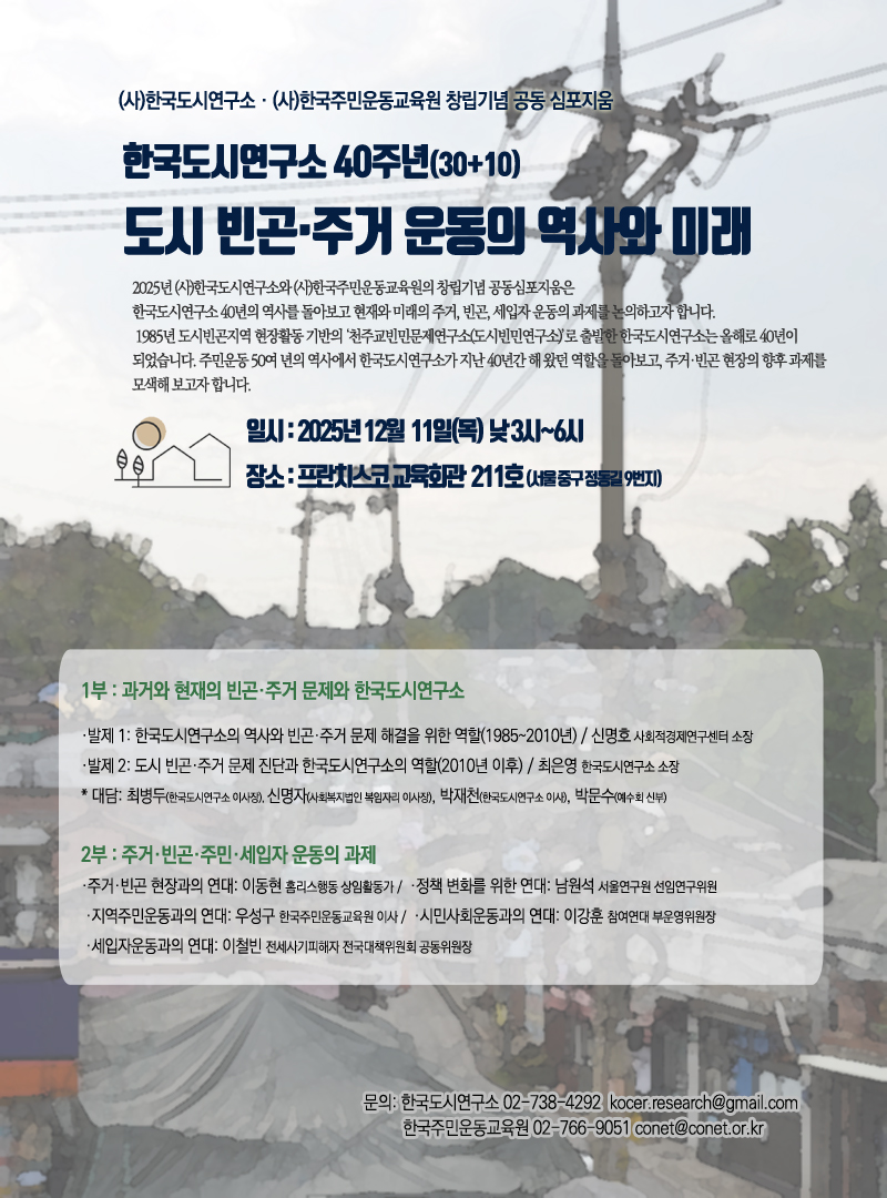 2025년 (사)한국도시연구소와 (사)한국주민운동교육원의 창립기념 공동심포지움은 한국도시연구소 40년의 역사를 돌아보고 현재와 미래의 주거, 빈곤, 세입자 운동의 과제를 논의하고자 합니다. 1985년 도시빈곤지역 현장활동 기반의 ‘천주교빈민문제연구소(도시빈민연구소)’로 출발한 한국도시연구소는 올해로 40년이 되었습니다. 주민운동 50여 년의 역사에서 한국도시연구소가 지난 40년간 해 왔던 역할을 돌아보고, 주거·빈곤 현장의 향후 과제를 모색해 보고자 합니다.
